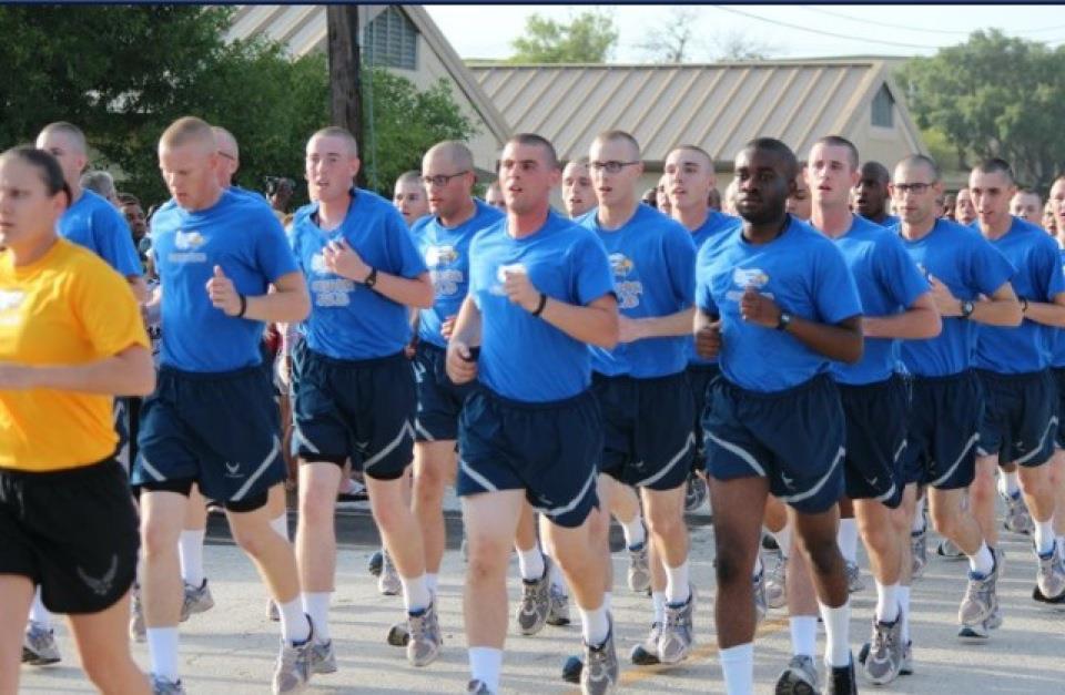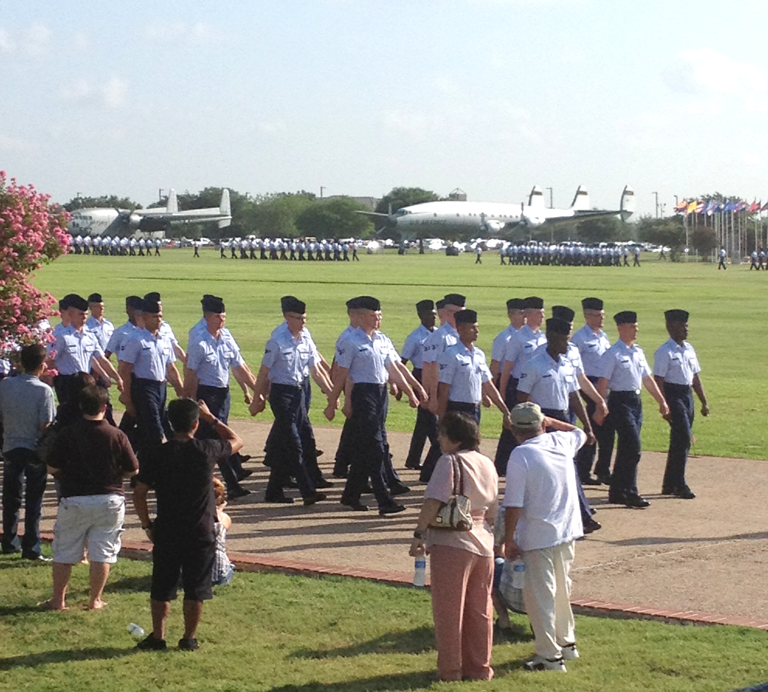 The first activity of BMT (Basic Military Training) Graduation is the Airman’s run! OH MY! How fun!! All the family and friends of the graduating Airmen stand on both sides of this road and cheer on their loved one. It’s the first time you will see them if you’re lucky enough to spot them running by. Lucky for me, my mother has a Scott radar and she found him before I did. It was so exciting to see him even if he wasn’t able to see us. (He says he THINKS he saw us cheering, but who really knows?) Here is a picture and video of him running by. In the video his flight runs by at 2 mins 40 secs. Try to find him. ;]
